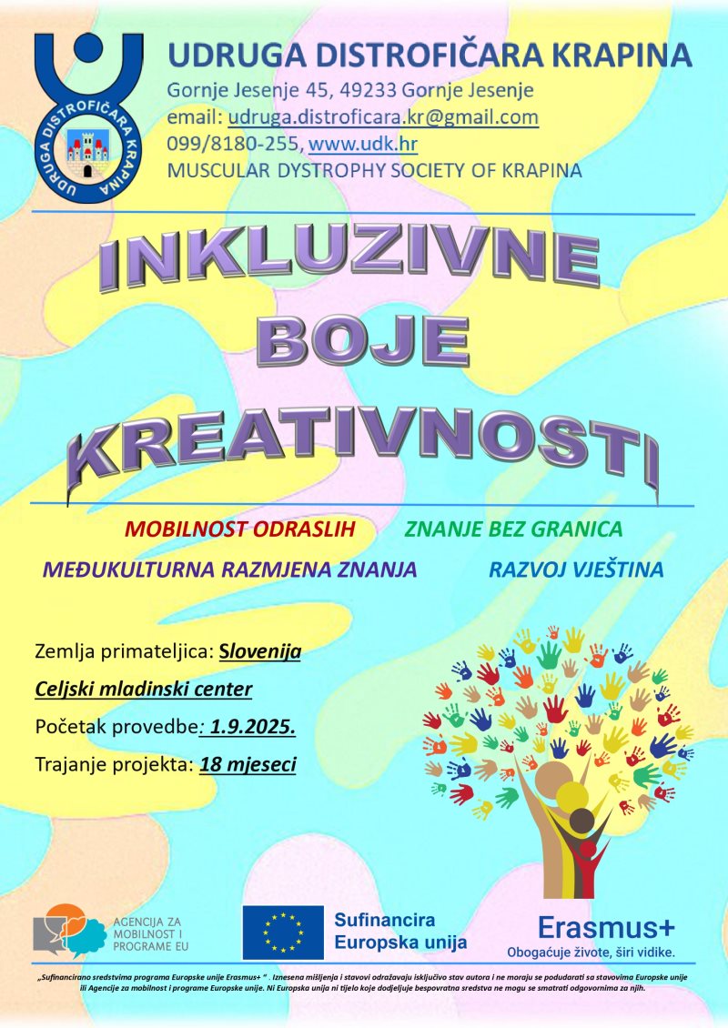 Udruga distrofičara Krapina u razdoblju od 1. rujna 2025. do 28. veljače 2027. godine provodi Erasmus+ projekt pod nazivom „Inkluzivne boje kreativnosti“, u okviru KA1 aktivnosti u području obrazovanja odraslih.